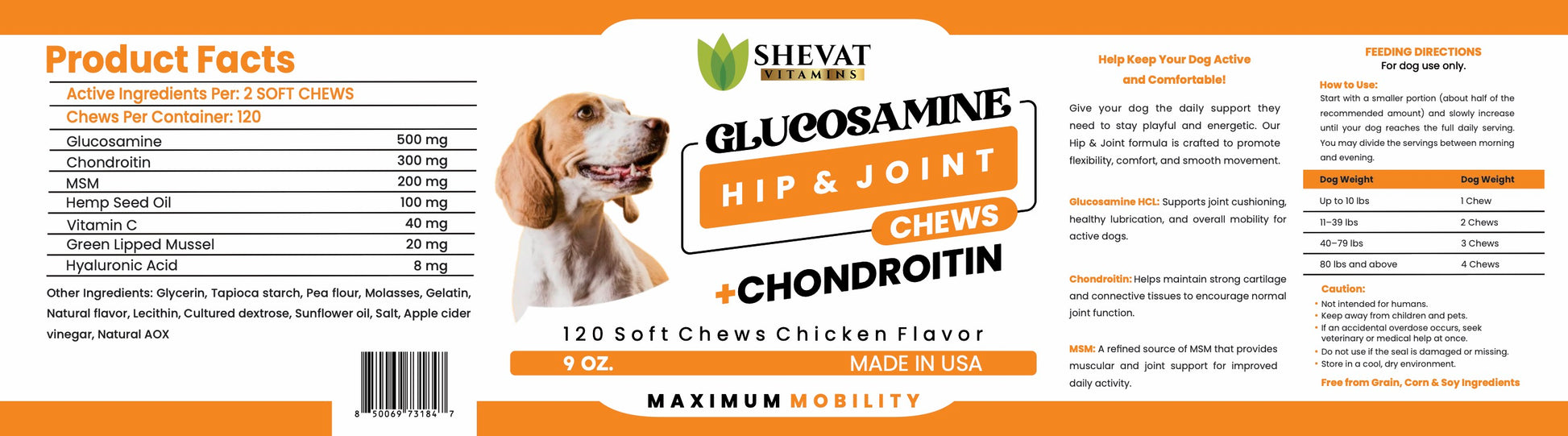 Shevat Vitamins Glucosamine for Dogs Hip & Joint Supplement Chews are designed to support mobility, flexibility, and overall joint health for dogs of all breeds and life stages. Each soft chew delivers a balanced blend of Glucosamine, Chondroitin, and MSM, working together to nourish cartilage, support joint function, and promote daily comfort.